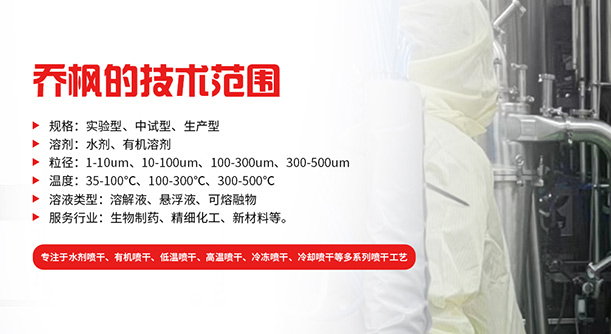 上海喬楓實業(yè)有限公司,成立于2012年,是從事粉體噴霧干燥機(jī)設(shè)備的研發(fā)、生產(chǎn)、銷售(小型噴霧干燥機(jī),實驗型噴霧干燥機(jī),氣流噴霧干燥機(jī),有機(jī)溶劑噴霧干燥機(jī),低溫噴霧干燥機(jī),低溫閉式循環(huán)噴霧干燥機(jī)、噴霧造粒干燥機(jī),離心噴霧干燥機(jī),壓力噴霧干燥機(jī),中藥浸膏噴霧干燥機(jī),沸騰制粒機(jī)等)和售后于一體的綜合性公司,本公司現(xiàn)成為一家致力于為新能源材料、精細(xì)化工、生物制藥以及食品工程等領(lǐng)域提供全套解決方案的整線交鑰匙工程企業(yè)。